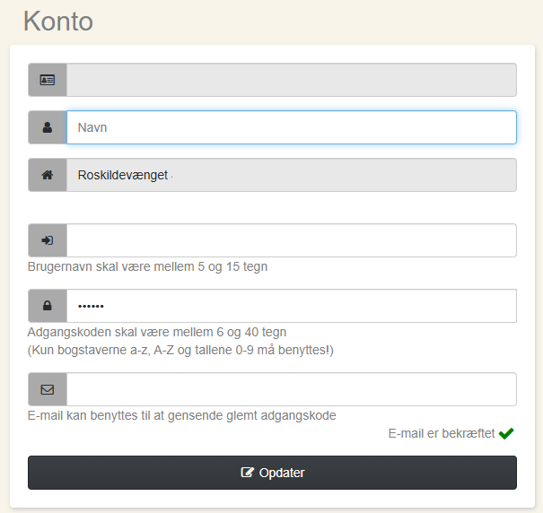 Her udfylder du de hvide felter med relevant information. Husk, brugernavn og adgangskode er det du skal bruge for at logge ind i fremtiden.